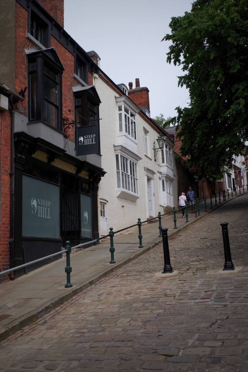 Lincoln. Een stad met een middeleeuws centrum met een kathedraal en een kasteel, boven op de heuvel. De straat er naar toe heet Steep Hill, zeer toepasselijk.